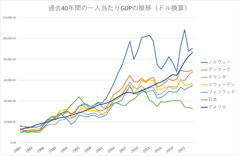 北欧諸国(ノルウェー、スウェーデン、デンマーク、フィンランド)とオランダは、社会保障が発達していることは多くの人が認めるところではあるが、その反面、経済成長が今一歩であるとの古い批判もある。そうではない。(図1)は、北欧諸国とオランダ、アメリカ、日本の一人当たりGDPの40年にわたる増加の推移を示したのだ。