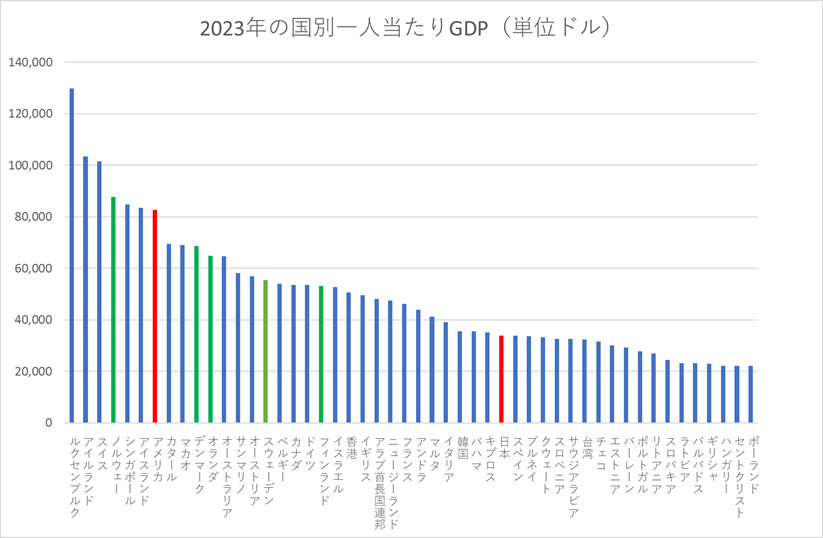 (図2)は現在の一人当たりGDPの国別順位である。4位のノルウェーから19位のフィンランドまで、北欧諸国は比較的上位に位置する。ちなみに日本は32位である。高福祉高負担の国々が、国民負担の低い日本より経済的に豊かになっている。従来の常識からは、不思議な現象だ。