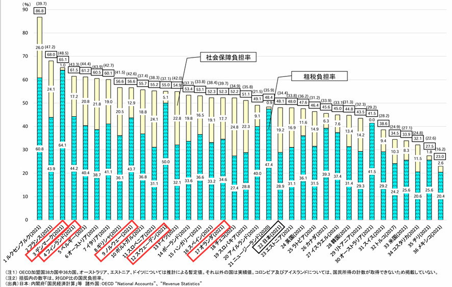 国民負担率(税と社会保障の負担を国民所得で割ったもの)は、デンマークは3位で66%、ノルウェーは9位で57%、オランダは17位で52%、ちなみに日本は22位で48%である。北欧諸国はいずれも日本より国民負担率が高いことが示されている。